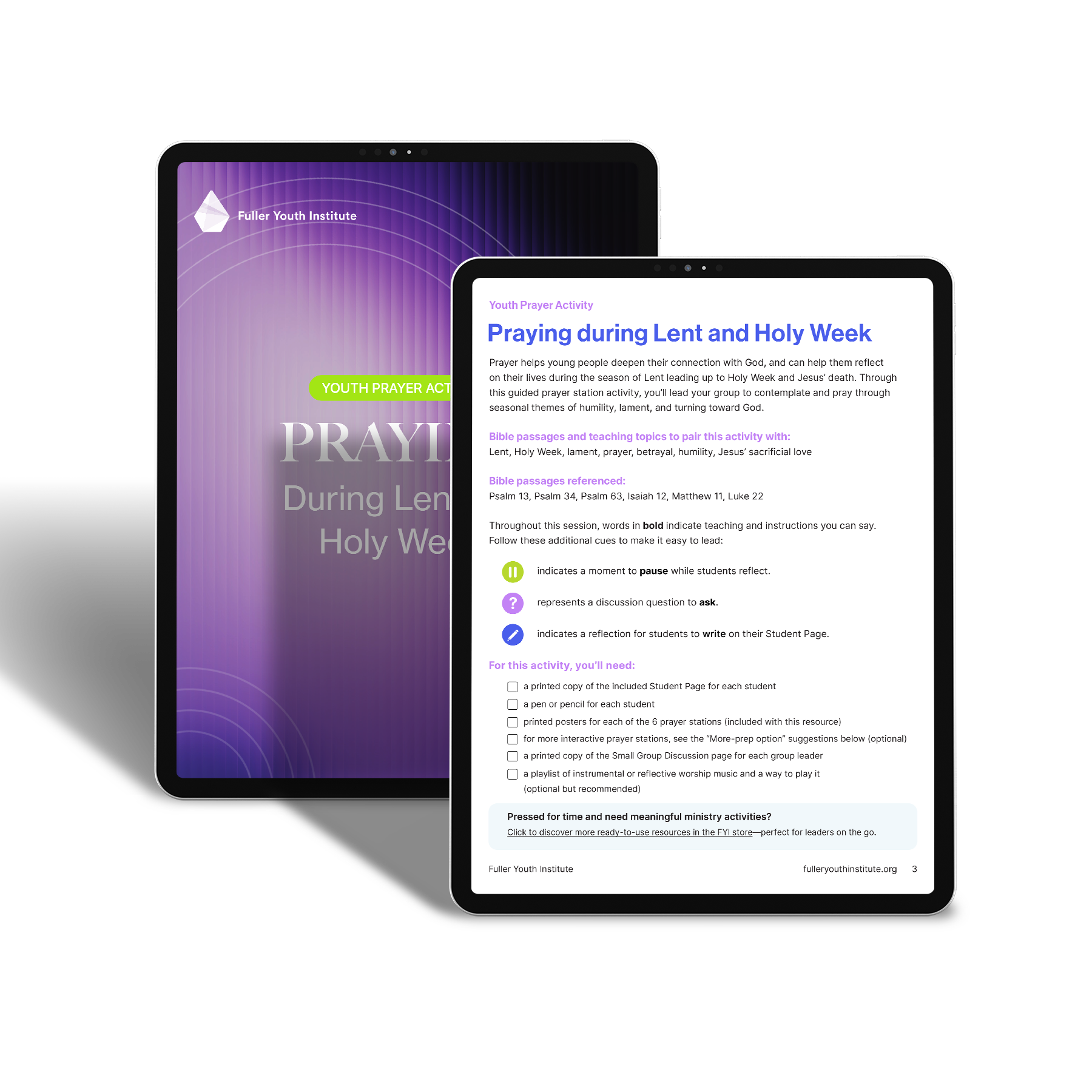 Prayer helps young people deepen their connection with God, and can help them reflect on their lives during the season of Lent leading up to Holy Week and Jesus’ death. Through this prayer station activity, you’ll lead your group to contemplate and pray through seasonal themes of humility, lament, and turning toward God.